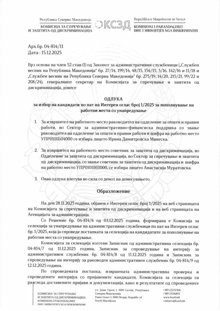 Одлука за избор на кандидати за унапредување по пат на интерен оглас во КСЗДдекември 15, 2025Новости, Огласна табла Комисијата за спречување и заштита од дискриминација донесе Одлука за пополнување на 2 работни места со унапредување.